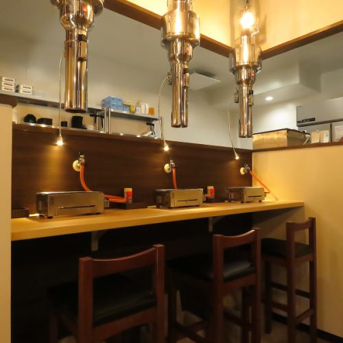 お一人様でのご利用にぴったりのカウンター席もご用意しています。専用のコンロと排煙設備が完備されているので、自分のペースでゆっくりと焼き肉を楽しめます。お仕事帰りや、ふらっと立ち寄りたい時に気軽にご利用いただけます。